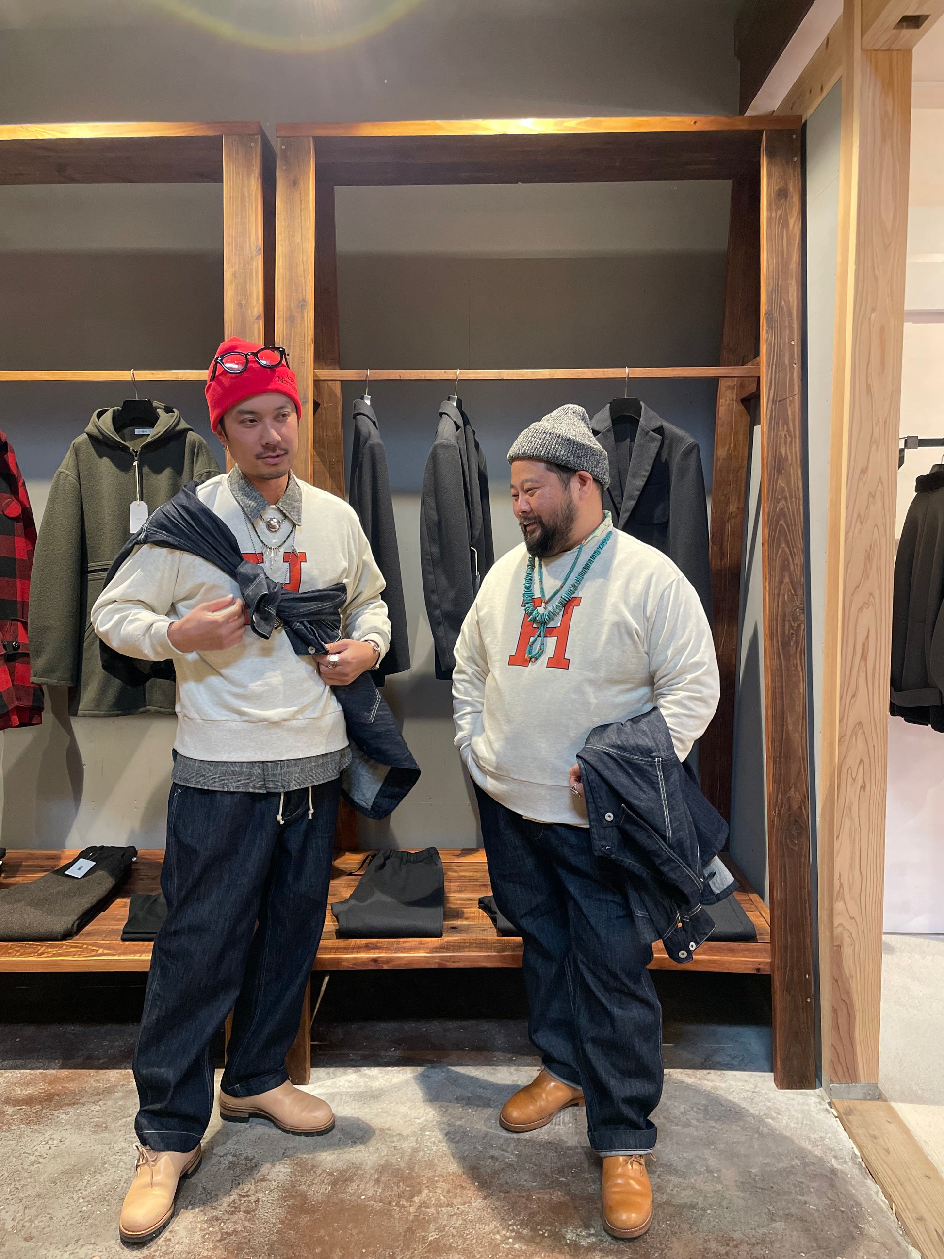 オートミールのボディにオレンジのHロゴが映えるNICEスウェット。